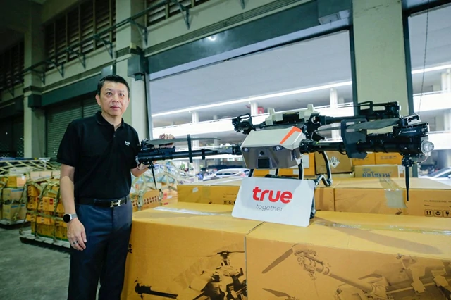 นายเอกราช ปัญจวีณิน หัวหน้าคณะผู้บริหารด้านดิจิทัล บมจ. ทรู คอร์ปอเรชั่น กล่าวว่า “หนึ่งในพันธกิจสำคัญของทรู คอร์ปอเรชั่น คือการนำศักยภาพด้านเทคโนโลยีดิจิทัลมาสร้างประโยชน์ให้แก่สังคม โดยเฉพาะในยามวิกฤต ซึ่งครั้งนี้ ได้นำโดรนพร้อมนักบินผู้เชี่ยวชาญเข้าร่วมเสริมภารกิจกู้ภัยและช่วยเหลือผู้ประสบภัย เพื่อให้การดำเนินงานเป็นไปอย่างมีประสิทธิภาพและสอดประสานกันทุกขั้นตอน ซึ่งฝูงโดรน ขนาดบรรจุ 25 ลิตร จำนวน 20 ลำนี้ มีความคล่องตัวสูง เหมาะสมต่อการลำเลียงสิ่งของจำเป็นและเข้าถึงพื้นที่ที่การสัญจรเป็นไปด้วยความยากลำบากในสถานการณ์อุทกภัยรุนแรงในพื้นที่ภาคใต้”