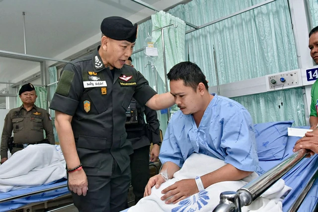 จากนั้น ผบ.ตร. เดินทางไปเยี่ยม ตชด. และทหารที่ได้รับบาดเจ็บ ซึ่งรักษาตัวที่ รพ.สรรพสิทธิประสงค์ จ.อุบลราชธานี โดย ผบ.ตร. กล่าวว่า ทราบว่ามีน้อง ๆ ทหาร และตำรวจตระเวนชายแดนได้รับบาดเจ็บ โดยตำรวจบาดเจ็บ 6 มี 3 นายที่ยังรักษาตัวที่ รพ. สรรพสิทธิประสงค์ อีก 3 นายกลับไปที่ตั้ง โดย 2 ใน 3 นายขอกลับไปพื้นที่แนวหน้าอีก ส่วนน้อง ๆ ทหารถือโอกาสมาเยี่ยมด้วย โดยนายอนุทิน ชาญวีรกูล นายกรัฐมนตรี โทรมาฝากเยี่ยม ฝากความห่วงใย ให้กำลังใจตำรวจและทหารที่ได้รับบาดเจ็บด้วย อย่างไรก็ตามขอเป็นกำลังใจให้ทหาร และตำรวจที่ร่วมรักษาแผ่นดินไทย ไม่ว่าอย่างไรหน้าที่ของเราทั้งตำรวจ ทหาร คือการรักษาอธิปไตย และที่สำคัญต้องดูแลประชาชนให้ปลอดภัยด้วย