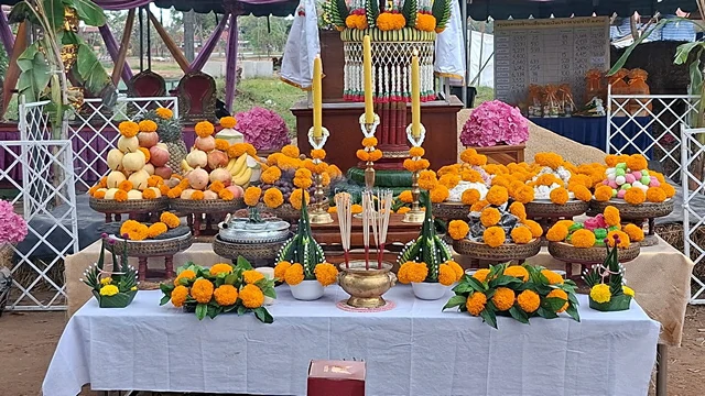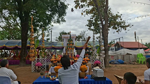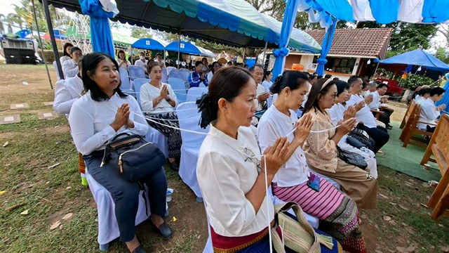 จากนั้นทุกภาคส่วนได้ร่วมกันฟังพระภิกษุสวดเจริญพุทธมนต์ พร้อมถวายอาหารเพลแด่พระภิกษุ พร้อมกันนี้ พระภิกษุได้มีการปะพรมน้ำมนต์ ให้แก่ผู้มาร่วมพิธีในครั้งนี้เพื่อความเป็นสิมงคลแก่ชีวิตอีกด้วย