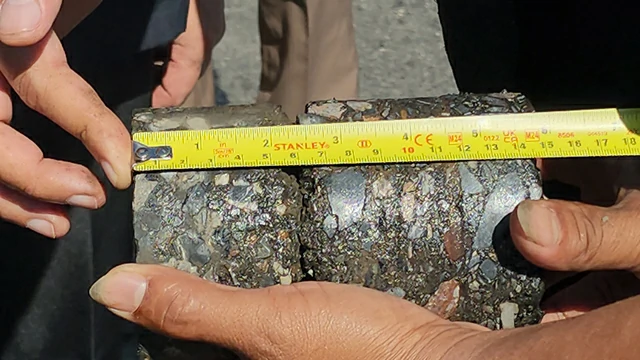 จากการลงตรวจได้มีการใช้วิธีการสุ่มเจาะ (Core Drilling) ถนนจำนวน 4 จุด ของความหนาของพื้นผิวถนนแอสฟัสติกท์ ซึ่งกำหนดความหน้าชั้นแรก 8 เซนติเมตร และชั้นสอง 5 เซนติเมตร รวมความหนาที่ต้องเจาะทดสอบออกมาเป็น “ก้อน” หรือแกนทรงกระบอก รวม 13 เซนติเมตร ผลพบว่าทั้งสองชั้นผิวทางไม่เชื่อมต่อกันเป็นก้อน เป็นลักษณะแยกก้อนแยกส่วนกัน