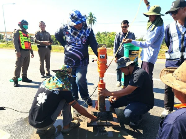 จากการลงตรวจได้มีการใช้วิธีการสุ่มเจาะ (Core Drilling) ถนนจำนวน 4 จุด ของความหนาของพื้นผิวถนนแอสฟัสติกท์ ซึ่งกำหนดความหน้าชั้นแรก 8 เซนติเมตร และชั้นสอง 5 เซนติเมตร รวมความหนาที่ต้องเจาะทดสอบออกมาเป็น “ก้อน” หรือแกนทรงกระบอก รวม 13 เซนติเมตร ผลพบว่าทั้งสองชั้นผิวทางไม่เชื่อมต่อกันเป็นก้อน เป็นลักษณะแยกก้อนแยกส่วนกัน