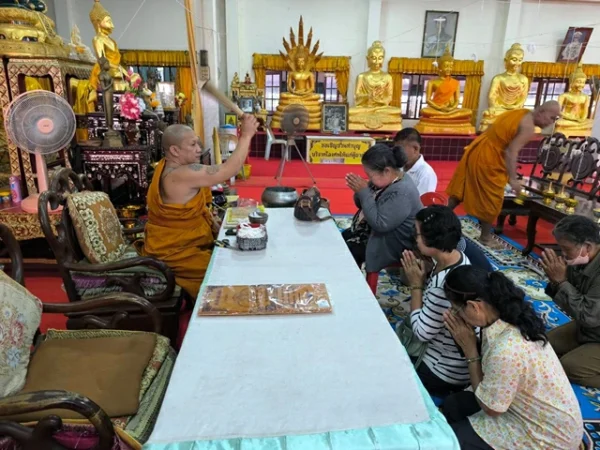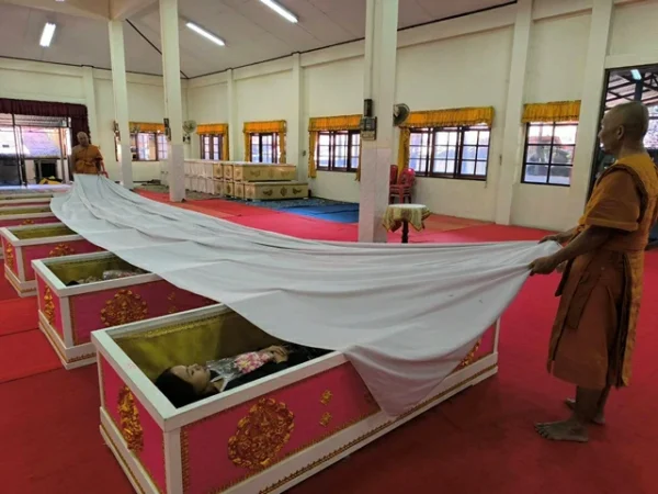 นครนายก – นักท่องเที่ยวสายมูให้ความศรัทธาเดินทางเข้าพิธีนอนโลงศพวัดหลวงพ่อปากแดงจังหวัดนครนายก