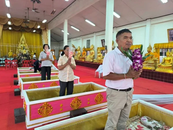 นครนายก – นักท่องเที่ยวสายมูให้ความศรัทธาเดินทางเข้าพิธีนอนโลงศพวัดหลวงพ่อปากแดงจังหวัดนครนายก