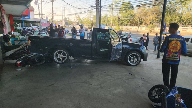 บุรีรัมย์ หนุ่ม เห็นกระบะแต่งซิ่งพี่ชายอยากลองขับ ชน 2 ผัวเมียรถพุ่งเข้าโชร์รูม