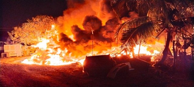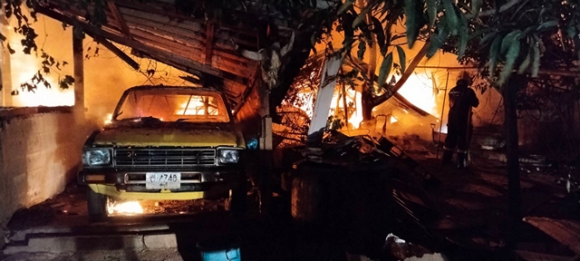 ซึ่งแสงเพลิงลุกไหม้โหมกระหน่ำนานกว่า 2 ชั่วโมง จึงสามารถควบคุมเพลิงไว้ได้ ซึ่งไฟได้ไหม้บ้านและโกดังวอดวายจนหมด โดยยังมีรถยนต์เสียหาย3คัน รถจักรยานยนต์เสียหายอีก5คันในกองเพลิง ซึ่งเป็นร้านรับซื้อของเก่าและขายอะไหล่รถยนต์พวกแบตเตอรี่รถยนต์จำนวนมาก รวมถึงอุปกรณ์ส่วนควบรถยนต์ ซึ่งมีอยู่เป็นจำนวนมากในโกดังเสียหายหมด รวมถึงกองโกดังที่มีของวางอยู่รอบๆบ้านก็ถูกเพลิงไหม้หมดในครั้งนี้ ซึ่งมูลค่าความเสียหายยังประเมินไม่ได้ต้องรอเพลิงสงบจึงจะตรวจสอบได้ ซึ่งทางเจ้าหน้าที่ตำรวจต้องรอกองพิสูจน์หลักฐานมาตรวจสอบว่าสาเหตุเพลิงไหม้เกิดจากสาเหตุที่ชัดเจนต่อไป