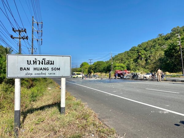 โดยรถที่เกิดเหตุเป็นรถกระบะแคป โตโยต้า วีโก้ สีดำ ลักษณะเป็นรถตู้ทึบของบริษัทส่งหมู ในอำเภอคลองใหญ่ หมายเลขทะเบียน บต 7119 ตราด ขับมาจากเขาล้านมุ่งหน้าไปอำเภอคลองใหญ่ ก่อนจะเสียหลักพุ่งชนเกาะยูเทิร์น บริเวณถนนสายสามบ้าน–ห้วงโสม อย่างแรง
