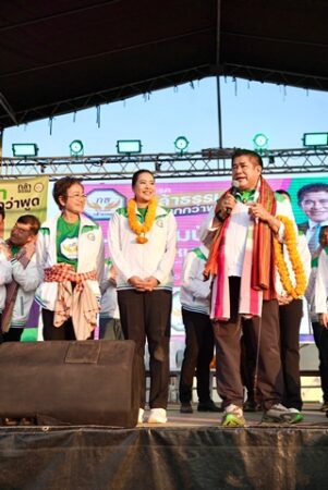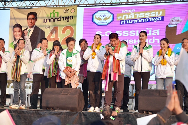 13 ม.ค. 68 ที่บริเวณลานตลาดนัดบ้านหินกอง ริมถนนมิตรภาพ ต.น้ำพอง อ.น้ำพอง จ.ขอนแก่น ร.อ.ธรรมนัส พรหมเผ่า รองนายกรัฐมนตรี และรัฐมนตรีว่าการกระทรวงเกษตรและสหกรณ์ ในฐานะประธานที่ปรึกษาพรรคกล้าธรรม พร้อมด้วย ศ.ดร.นฤมล ภิญโญสินวัตน์ หัวหน้าพรรคกล้าธรรม นาวาเอก อนุดิษฐ์ นาครทรรพ ประธานยุทธศาสตร์พรรคกล้าธรรม นายกองตรี ดร.ธนกฤต จิตรอารีย์รัตน์ เลขานุการรัฐมนตรีว่าการกระทรวงการพัฒนาสังคมและความมั่นคงของมนุษย์ นายเอกราช ช่างเหลา รองหัวหน้าพรรคกล้าธรรม และคณะผู้บริหารพรรคกล้าธรรม ได้เปิดเวทีปราศรัยใหญ่หาเสียงเลือกตั้งจากประชาชนชาวขอนแก่น ในเขตเลือกตั้งที่ 4 ให้กับ น.ส.อาทิตยา พงษ์สมบัติ ผู้สมัคร สส.ขอนแก่น เขต 4 พรรคกล้าธรรม โดยมีผู้สมัคร สส.เขต ขอนแก่น, อุดรธานี, สกลนคร,หนองบัวลำภู รวมทั้งผู้สมัคร สส.บัญชีรายชื่อ พรรคกล้าธรรม อาทิเช่น นางมุกดา พงษ์สมบัติ นายไชยยา พรหมา ขึ้นร่วมเวที ปราศรัยท่ามกลางประชาชนที่เดินทางมาร่วมรับฟังการปราศรัยกว่า 10,000 คน