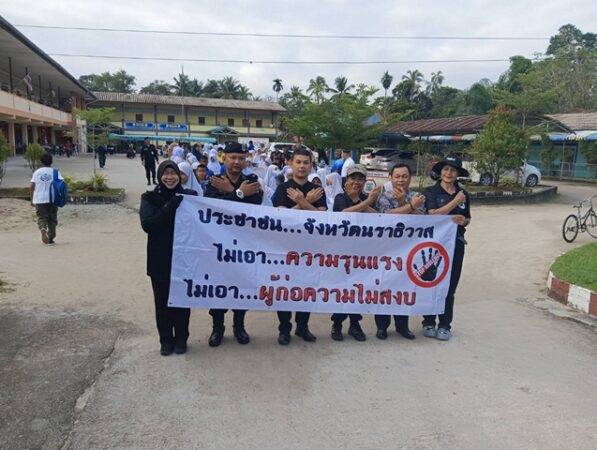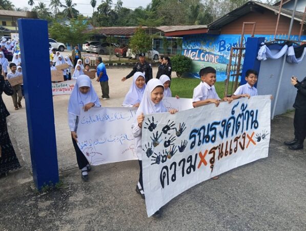นราธิวาส-“หยุดสักที” นักเรียนจับมือผู้นำเดินขบวนต่อต้าน ยุติความรุนแรง ขอความสงบในพื้นที่แผ่นดินไทย