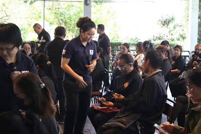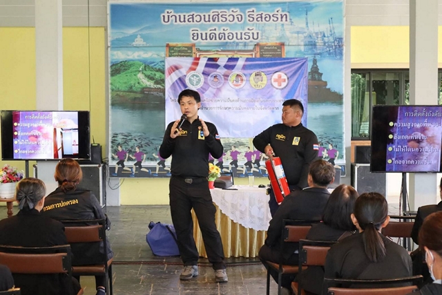 การบรรยายจากวิทยากรสำนักงานป้องกันและบรรเทาสาธารณภัยจังหวัดตาก ในหัวข้อการป้องกันและรับมือสาธารณภัยที่เกิดขึ้นในพื้นที่ การปฐมพยาบาลเบื้องต้น และการเคลื่อนย้ายผู้บาดเจ็บออกจากพื้นที่อันตราย พร้อมการสาธิตและฝึกปฏิบัติ