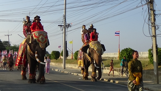โดยตั้งแต่เวลา 16.00 น.ที่บริเวณหน้าเทศบาลตำบลป่าโมก มีการเคลื่อนขบวนเดินทัพของสมเด็จพระนเรศวรมหาราช ประกอบไปด้วยขบวนช้าง ม้า ขบวนอำเภอป่าโมก ขบวนกำนัน ผู้ใหญ่บ้าน ขบวนองค์กรปกครองส่วนท้องถิ่น และขบวนสถานศึกษา ผ่านตลาดป่าโมก จนถึงบริเวณวัดป่าโมกวรวิหาร พระศรีสุทธิโสภณ(ป.ธ.9)เจ้าอาวาสวัดป่าโมกวรวิหาร พรมน้ำมนต์ให้แก่ขบวน จากนั้นขบวนเคลื่อนไปยังหน้าพระบรมราชานุสาวรีย์สมเด็จพระนเรศวรมหาราช เพื่อสักการะ