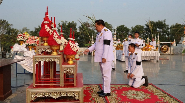 โอกาสนี้ ประธานฯ ได้ถวายมาลัยพวงใหญ่บริเวณฐานด้านบนพระบรมราชานุสาวรีย์ฯ รวมทั้งด้านล่างมณฑลพิธี องค์พระแสงดาบ พระแสงทวน และพระแสงปืน จากนั้น ได้ประกอบพิธีถวายราชสักการะวางพุ่มดอกไม้สด จุดธูปเทียน ที่เครื่องทองน้อย ถวายบังคมพระบรมราชานุสาวรีย์ฯ หลังจากนั้น ได้บวงสรวงดวงพระวิญญาณสมเด็จพระนเรศวรมหาราช และกล่าวคำถวายราชสดุดี เพื่อน้อมรำลึกถึงเหตุการณ์สำคัญทางประวัติศาสตร์ของชาติไทยในสมัยกรุงศรีอยุธยา เป็นอันเสร็จพิธีในช่วงเช้า สำหรับช่วงบ่าย ในเวลา 16.00 น. เป็นต้นไป จะมีพิธีเจริญพระพุทธมนต์ สวดพาหุงมหากา 9 จบ เพื่อความเป็นสิริมงคลแก่ประชาชนชาวจังหวัดพระนครศรีอยุธยาสืบไป