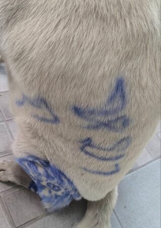 แต่วันนี้สังเกตุว่าเจ้าขาวทำไมเปลี่ยนไปจากเดิม พบว่าได้มีจิตกรนิรนามได้ใช้ปากกาเคมีสีน้ำเงิน เขียนคิ้ว เขียนแวนตา เขียนที่ลำตัว เขียนว่าหมาดุ และเขียนที่ขาด้านซ้ายหน้า-หลังเป็นลายพ้อย์คล้ายสักลายมังกร ดูแล้วแปลกตาไป เจ้าขาวหมาจรตัวนี้ช่วงเช้าๆจะมานั่งใกล้ๆร้านแม่ค้าขายปลาทอดมัอยู่เป็นประจำ และจะมีชาวบ้านได้เอาอาหารเม็ดหรือข้าวมาให้เจ้าขาวกินอยู่เป็นประจำอย่างนี้ทุกวัน