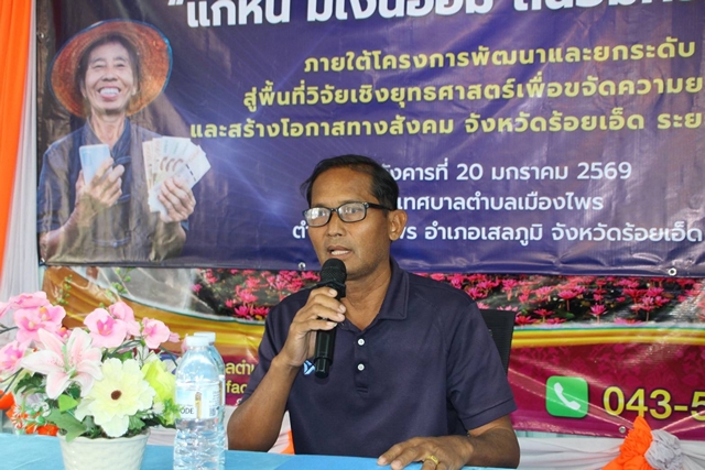 เวลา 09.30 น. ณ ห้องประชุมเทศบาลตำบลเมืองไพร อำเภอเสลภูมิ จังหวัดร้อยเอ็ด นายสุทธิศักดิ์ จันทรา รองนายกเทศมนตรีตำบลเมืองไพร เป็นประธานเปิดการอบรมเชิงปฏิบัติการ “เมืองไพร แก้หนี้ มีเงินออม มถนอมความสุข” ภายใต้โครงการพัฒนาและยกระดับสู่พื้นที่วิจัยเชิงยุทธศาสตร์เพื่อขจัดความยากจนและสร้างโอกาสทางสังคม จังหวัดร้อยเอ็ด