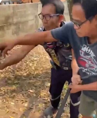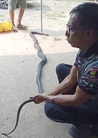 จึงค่อยๆรื้อไม้ออกพบว่าเป็นงูจงอางขนาดใหญ่ที่มีความดุร้าย จึงได้ประสานไปที่ศูนย์วิทยุกู้ภัยสว่างอริยะนครนายก มาร่วมกันจับงูจงอางในครั้งนี้ กู้ภัยฯต้องใช้ความระมัดระวังเนื่องจากงูจงอางเป็นงูที่ดุร้าย จึงได้ใช้อุปกรณ์ที่นำมาคีบไปที่ห้วงูจงอาจแล้วช่วยกันจับหัวและหางออกมาจากกองไม้วัดความยาวได้ 3 เมตรครึ่ง มีน้ำหนัก 25 กิโลกรัม จึงได้จับงูจงอางใส่ถุงปุ๋ยนำไปปล่อยในแหล่งธรรมชาติต่อไป