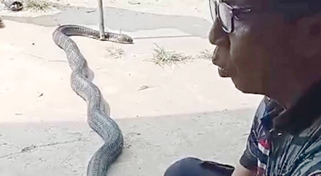 เมื่อเวลา 11.00 น.ของวันที่ 21 มกราคม 2569 ศูนย์วิทยุกู้ชีพองค์การบริหารส่วนตำบลนาหินลาด ได้รับแจ้งจากนางศรีสุดา เนื่องจากจุ้ย อายุ 73 ปีเจ้าของบ้านเลขที่ 49 หมู่ที่ 6 บ้านท่ามะปราง ตำบลนาหินลาด ว่าพบงูจงอาง หรืองูบองหลา ที่มีขนาดใหญ่ซุกตัวนอนอยู่ใต้กองไม้เก่าข้างบ้าน จึงได้เดินทางไปพร้อมอุปกรณ์ในการจับงู ไปยังที่รับแจ้งเหตุ พบว่างูจงอาง นอนซุกตัวนอนอยู่ใต้กองไม้
