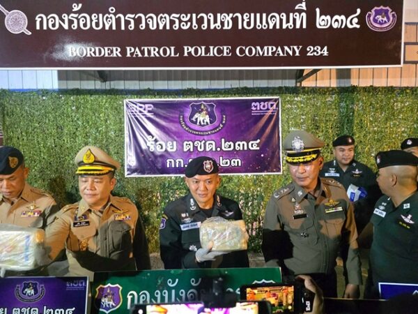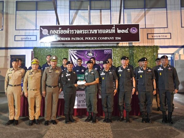 พ.ต.ท.บุญเลิศ วิเศษชาติ รองผู้กำกับการ ตชด.23 พ.ต.ท.ปรัชญลักษณ์ วิลาทัน รองผู้กำกับการหัวหน้ากองร้อย ตชด.234 และ พ.ต.ท.วัฒนพล ดาแก้ว ผู้บังคับกองร้อย ตชด.234 ร่วมแถลงผลการจับกุมขบวนการค้ายาเสพติดข้ามชาติ จับกุมผู้ต้องหาชาว สปป.ลาว 2 ราย พร้อมของกลางยาบ้าประมาณ 820,000 เม็ด