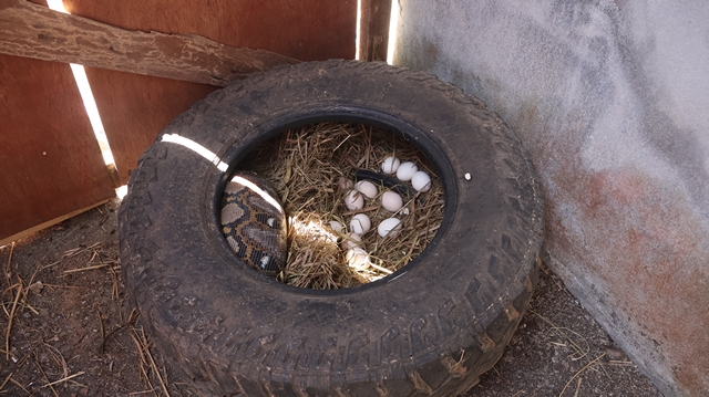 นายแวมะ แวและ อายุ 56 ปี เจ้าของไก่ดำ เล่าว่า ได้ซื้อไก่ดำมา 6 ตัว มีตัวผู้ 1 ตัว ตัวเมีย 5 ตัว และจะนำไปเลี้ยงในสวน แต่ได้นำมาเลี้ยงไว้ที่เล้านี้ก่อน ก่อนหน้านี้ไก่ดำตัวเมียก็หายไป 2 ตัวแล้ว ซึ่งก็คาดว่าโดนงูเหลือมตัวนี้กินไป วันนี้ขณะที่ตนกำลังจะนำอาหารไปให้ไก่กิน พอเปิดประตูเดินเข้าไปก็เห็น งูนอนอยู่ในรังแม่ไก่ที่กำลังฟักไข่ จึงได้โทรศัพท์แจ้งกู้ภัยให้มาช่วยจับงู