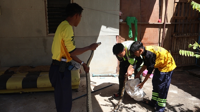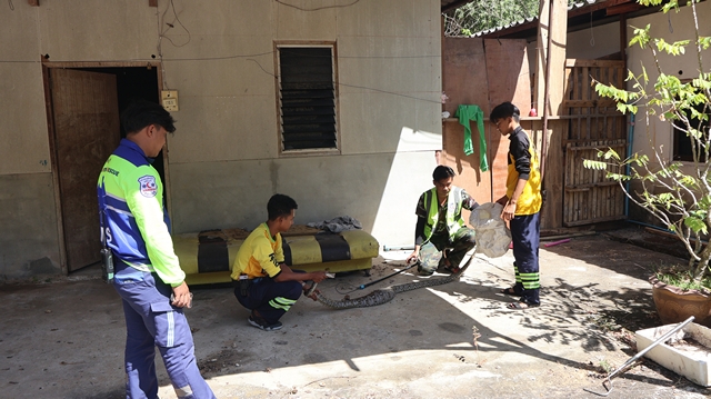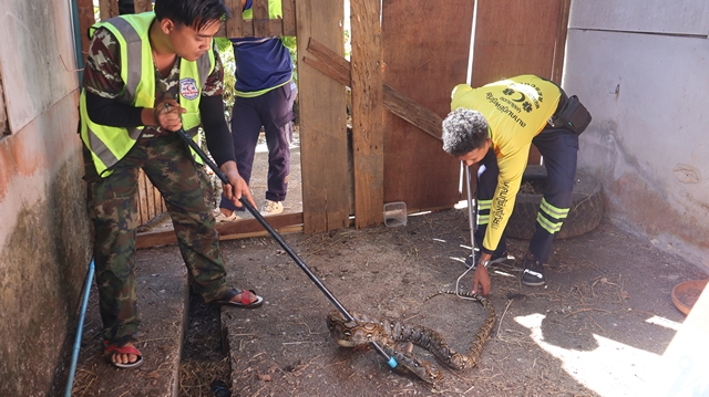 ยะลา-เบตง งูเหลือมกินแม่ไก่ดำกำลังฟักไข่ในเล้า เจ้าของแจ้งกู้ภัยจับปล่อยคืนสู่ป่าธรรมชาติ