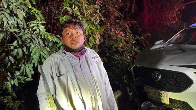 ชลบุรี-เก๋งข้ามเลนชน จยย. กระเด็นตกไหล่เขา 5 เมตร เจ้าหน้าที่ต้องปีนลงไปช่วย