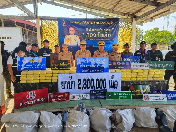 เมื่อวันที่ 30 มกราคม ที่สถานีเรือมุกดาหาร จังหวัดมุกดาหาร นายวรญาณ บุญณราช ผู้ว่าราชการจังหวัดมุกดาหาร พร้อมด้วย พล.ร.ต.ณรงค์ เอมดี ผู้บัญชาการหน่วยเรือรักษาความสงบเรียบร้อยตามลำแม่น้ำโขง (ผบ.นรข.) น.อ.แมนรัตน์ บุญสวัสดิ์ ผู้บังคับหน่วยเรือรักษาความสงบเรียบร้อยตามลำแม่น้ำโขง เขตนครพนม นางศศิธร โพดาพล นายอำเภอหว้านใหญ่ พ.ต.อ.เจด็จ ปรีพูล ผู้กำกับการ สภ.หว้านใหญ่ และ น.ท.โอรส พุทธโค หัวหน้าสถานีเรือมุกดาหาร ร่วมกันแถลงข่าวการตรวจยึดยาเสพติดให้โทษประเภท 1 (ยาบ้า) จำนวน 2,800,000 เม็ด พร้อมเรือกีบติดเครื่องยนต์ 1 ลำ