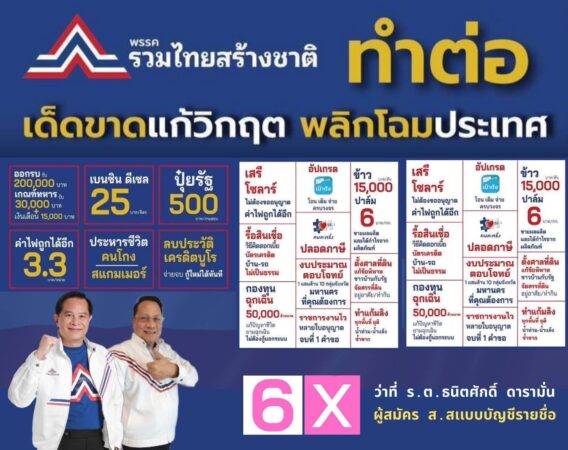 พรรครวมไทยสร้างขอเสียงโค้งสุดท้าย..เข้าคูหากาเบอร์ 6เพื่อดูแลชีวิตความเป็นอยู่ของพี่น้องประชาชนตามนโยบายปราบทุนพลังงานต่อไป