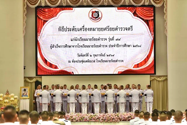 วันนี้ (2 กุมภาพันธ์ 2569) เวลา 15.15 น. พล.ต.อ.กิตติ์รัฐ พันธุ์เพ็ชร์ ผู้บัญชาการตำรวจแห่งชาติ (ผบ.ตร.) เป็นประธานพิธีประดับเครื่องหมายยศแก่นักเรียนนายร้อยตำรวจ รุ่นที่ 79 ผู้สำเร็จการศึกษาจากโรงเรียนนายร้อยตำรวจ ประจำปีการศึกษา 2568 จำนวน 280 นาย ณ ห้องเตมียเวส โรงเรียนนายร้อยตำรวจ อ.สามพราน จ.นครปฐม พร้อมด้วย พล.ต.อ.กรไชย คล้ายคลึง รอง ผบ.ตร., พล.ต.อ.สำราญ นวลมา รอง ผบ.ตร., พล.ต.อ.อิทธิพล อัจฉริยะประดิษฐ์ จเรตำรวจแห่งชาติ, พล.ต.ท.อนุชา รมยะนันทน์ ผู้ช่วย ผบ.ตร., พล.ต.ท.ยิ่งยศ เทพจำนงค์ ผู้ช่วย ผบ.ตร. และ พล.ต.ท.ไตรรงค์ ผิวพรรณ รองจเรตำรวจแห่งชาติ ร่วมพิธี โดยมี พล.ต.ท.ศักดิ์รพี เพรียวพานิช ผู้บัญชาการโรงเรียนนายร้อยตำรวจ และคณะผู้บังคับบัญชา ให้การต้อนรับ