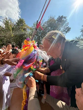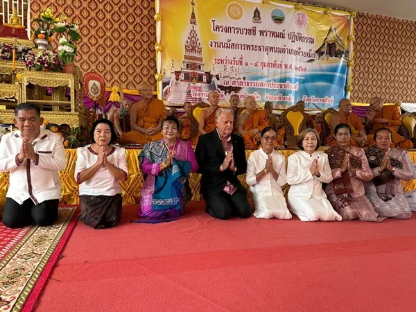 คณะสงฆ์ –พุทธศาสนิกชนชาวจังหวัดกาฬสินธุ์ ร่วมอนุโมสาธุกับครอบครัวไรเนอร์ ชาวเยอรมัน “เขยห้วยเม็ก หัวใจพุทธ” ถวายเกตุมาลาพระพุทธรูปศักดิ์สิทธ์ องค์พระประธานศาลาธรรมสภาประชาภิรมย์ วัดธรรมพิทักษ์ ในงานนมัสการพระธาตุพนมจำลองห้วยเม็ก ประจำปี 2569