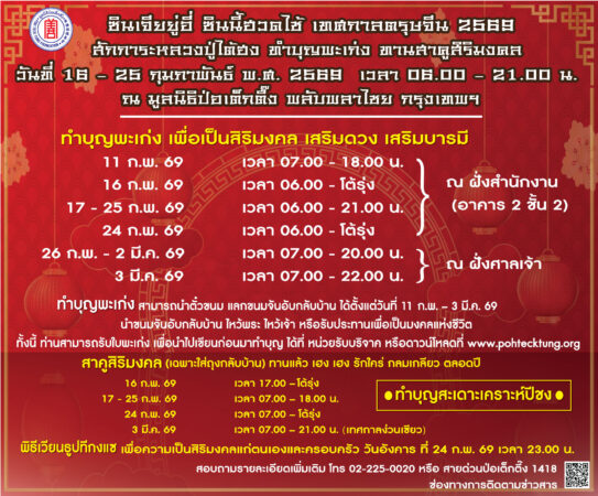 ระหว่างวันที่ 16 – 25 กุมภาพันธ์ พ.ศ. 2569 มูลนิธิป่อเต็กตึ๊ง โดย นายวิเชียร เตชะไพบูลย์ ประธานกรรมการ ขอเชิญศิษยานุศิษย์ และสาธุชนทุกท่าน ร่วม “สักการะหลวงปู่ไต้ฮง” ขอพรเนื่องในเทศกาลตรุษจีน ลงชื่อ สวดชัยมงคลคาถา หรือ “พะเก่ง” เพื่อความเป็นสิริมงคลตลอดปี เป็นพิธีมหามงคลใหญ่ 1 ปีมีเพียงครั้งเดียว ที่เปิดให้ทุกท่านได้เลือกทำบุญพะเก่งๆ ละ 20 บาทตามแต่ประสงค์ ประกอบด้วย ขอให้ครอบครัวมีสุข (แกหมึ่งเก่ง) , สะเดาะเคราะห์ (ปออุ่งเก่ง) , เสริมโชคลาภ (คิ่วไฉ่เก่ง) , เสริมดวงชะตา (ส่วยกุงเก่ง) , เสริมความมั่นคงสถาพร (กึงกีเก่ง) รวมถึงทำบุญสะเดาะเคราะห์และเสริมความเป็นสิริมงคลกับรูปปั้นนักษัตรปีมะเมีย รับประทาน “สาคูสิริมงคล” เพื่อความกลมเกลียวและอยู่เย็นเป็นสุข อัญเชิญ “ฮู้แดง” (ยันต์) ของหลวงปู่ไต้ฮง เพื่อนำไปประทับหน้าบ้าน เคหะสถาน หรือพกติดตัวเพื่อคุ้มครอง “เคาะระฆังทอง” ให้ก้องกังวานเพื่อให้ชีวิตสดใส การงานรุ่งเรืองระบือไกล และ ร่วม “พิธีเวียนธูปศักดิ์สิทธิ์” เพื่อขอพรเทพยดาฟ้าดินเนื่องในวันประสูติ (ทีกงแซ) ซึ่งในปีนี้ตรงกับวันอังคารที่ 24 กุมภาพันธ์ 2569 ขออำนาจฟ้าดินเป็นที่พึ่ง ขอให้สิ่งศักดิ์สิทธิ์ที่ตนนับถือ เช่น หลวงปู่ไต้ฮง ช่วยดลบันดาลให้ประสบโชคดีตลอดปีใหม่ (โดยในวันที่ 16 และ 24 กุมภาพันธ์ 2569 มูลนิธิป่อเต็กตึ๊ง เปิดบริการโต้รุ่ง)