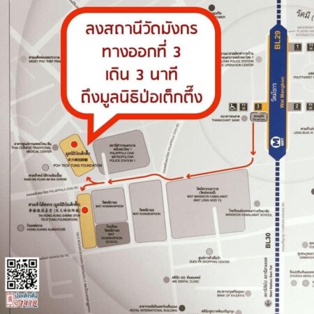 ทั้งนี้ เนื่องจากมีผู้มีจิตศรัทธามาร่วมทำบุญบริจาคเป็นจำนวนมาก อาจส่งผลให้ผู้ที่ใช้เส้นทางใกล้เคียงมูลนิธิฯ ได้แก่ ถนนพลับพลาไชย ถนนเจ้าคำรพ ถนนมังกร ถนนหลวง ถนนเสือป่า ไม่ได้รับความสะดวกในการสัญจร มูลนิธิป่อเต็กตึ๊งจึงขออภัย