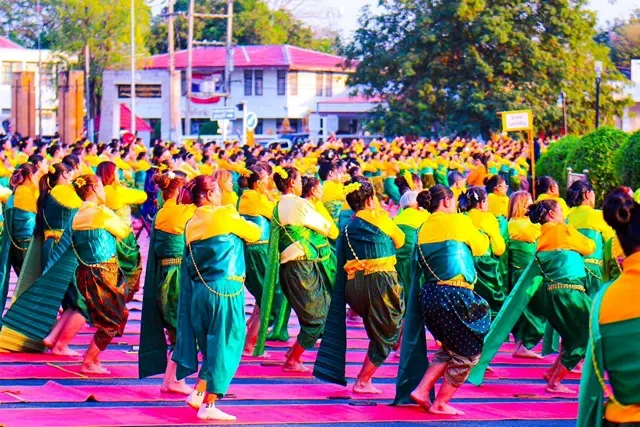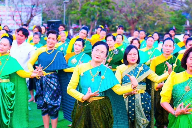 และร่วมกันร้อง”ส่งนางฟ้ากลับสวรรค์” เพื่อถวายความอาลัยแด่ สมเด็จพระนางเจ้าสิริกิติ์ พระบรมราชินีนาถ พระบรมราชชนนีพันปีหลวง ซึ่งการแต่งกายของนางรำ ผู้หญิงนุ่งโจงสีเขียว เสื้อสีเหลืองดอกคูนแขนยาว สไบใหญ่สีเขียว ส่วนผู้ชายนุ่งโจงสีเขียว เสื้อสีเหลืองดอกคูน คาดผ้าที่เอวสีเขียว เป็นการสื่อความหมายว่าสีเหลือง หมายถึง วันพระราชสมภพของสมเด็จพระนารายณ์มหาราช ที่ตรงกับวันจันทร์ ส่วน สีเขียว หมายถึง ความอุดมสมบูรณ์ของเมืองละโว้ธานี หรือจังหวัดลพบุรี ซึ่งในปีนี้มีผู้รำบวงสรวงฯ จาก 11 อำเภอ จำนวนรวมทั้งสิ้น 5,120 คนเข้าร่วมรำอย่างพร้อมเพรียงกัน