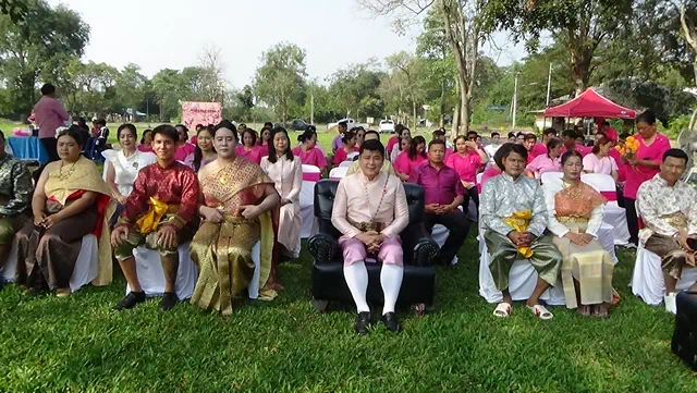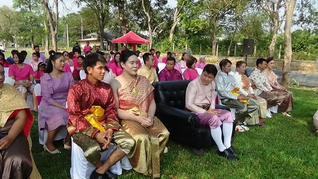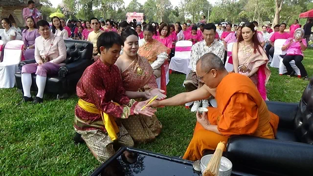 ซึ่งในพิธีมีพระมหาสมปอง ธมมภาณี เจ้าคณะตำบลคำหยาด เจ้าอาวาสวัดคำหยาด เจิมมือ พร้อมประพรมน้ำพระพุทธมนต์ แก่คู่บ่าวสาวทั้ง 6 คู่ จากนั้นเป็นการจดทะเบียนคู่สมรสทั้ง 6 คู่โดยมีนายพิสิษฐ์ วิระขันคำ นายอำเภอโพธิ์ทอง เป็นนายทะเบียน