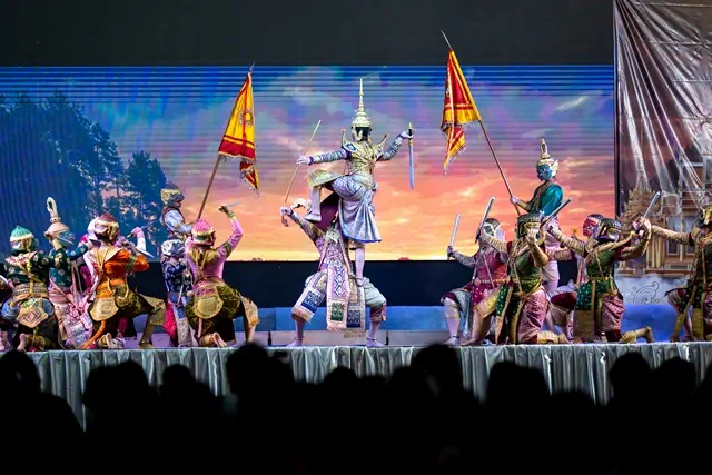 การแสดงเริ่มต้นด้วย การแสดงเบิกโรง : ชุด “ฉุยฉายกิ่งไม้เงินทอง” อันอ่อนช้อยงดงามของนาฏศิลป์ไทย และการแสดงโขนเรื่องรามเกียรติ์ ตอน “ศึกแสงอาทิตย์ และศรพรหมมาสตร์” ที่ถ่ายทอดเรื่องราวการแก้แค้นของ “แสงอาทิตย์” หลานทศกัณฐ์ที่ยกทัพมาสู้กับทัพพระรามแต่พ่ายแพ้และตายด้วยฤทธานุภาพของศรพรหมาสตร์ อาวุธวิเศษที่พระอิศวรประทานให้ ซึ่งเป็นศรสังหารยักษ์ที่สำคัญที่สุดของฝ่ายพระราม