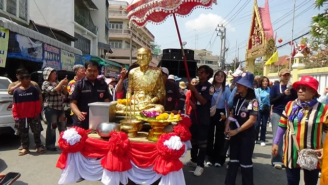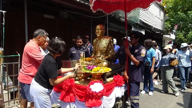 โดยเหล่าบรรดาศิษย์ยานุศิษย์ของหลวงพ่อนุ่มและหลวงพ่อชมได้ร่วมใจกันแห่รูปหล่อหลวงพ่อทั้ง 2 องค์ไปทั่วทั้งตลาด 100 ปี ไม่ว่ารูปหล่อหลวงพ่อนุ่มและหลวงพ่อชมผ่านไปถึงหน้าร้านไหนจะมีคนไทยเชื้อสายจีนและประชาชนออกมากราบไหว้ปิดทอง พร้อมกันนั้นได้จุดประทัดเพื่อเริ่มขบวนแห่ จนได้เลข 485 และ 72