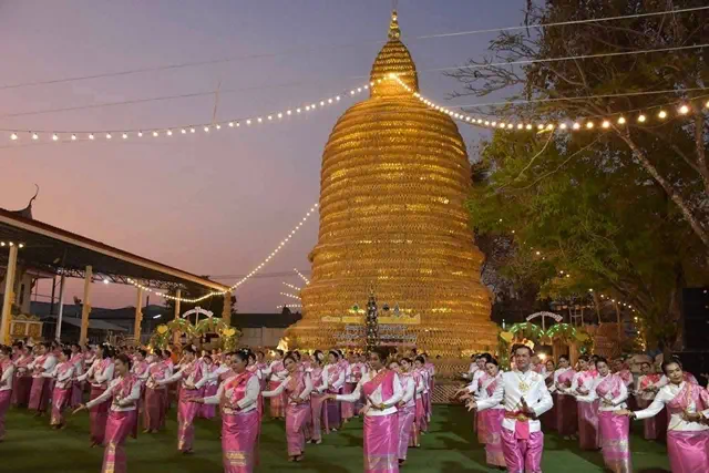 ระหว่างพิธี ชาวบ้านถือรวงข้าวร่ายรำรอบเจดีย์ข้าวเปลือก 3 รอบ พร้อมลูบองค์เจดีย์ตามความเชื่อเพื่อความเป็นสิริมงคล ปีนี้ยังพัฒนาต่อยอดงานประเพณี โดยอำเภอวังโป่ง สภาวัฒนธรรม และเทศบาลตำบลวังโป่ง ร่วมกันตกแต่งรวงข้าวอย่างสวยงาม เปิดให้นักท่องเที่ยวชม–ถ่ายภาพ และเชิญพระนักเทศน์ชื่อดังประกอบพิธี เพิ่มสีสันและความศักดิ์สิทธิ์