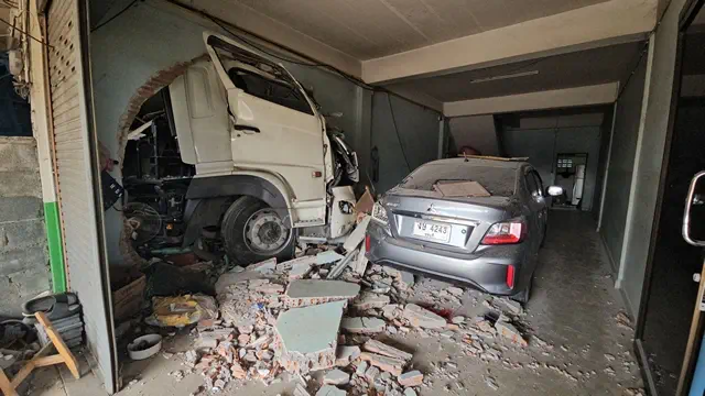 ชลบุรี-ชนวินาศ รถพ่วง 18 ล้อพุ่งชนตึกพาณิชย์ หวิดถล่มทั้งตึก คนขับ แม่ค้าส้มตำ เจ็บ