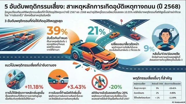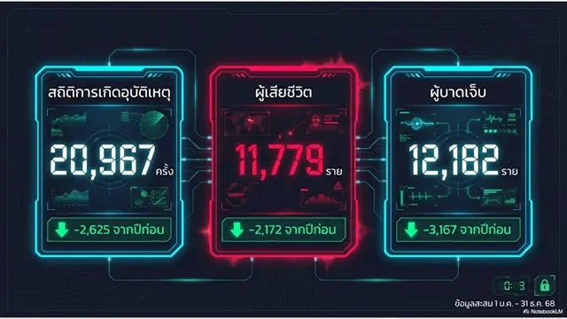 สถิติข้อมูลการเกิดอุบัติเหตุทางถนนปี 2568 จากระบบ PRS พบว่าอุบัติเหตุทางถนนเกิดขึ้น 20,967 ครั้ง ลดลงจากปีก่อนกว่า 11% ผู้เสียชีวิต 11,779 ราย ลดลงกว่า 15% และผู้บาดเจ็บ 12,182 ราย ลดลงกว่า 20% สะท้อนผลจากการทำงานเชิงรุกของตำรวจจราจรทั่วประเทศ อย่างไรก็ตาม สาเหตุหลักของการเกิดอุบัติเหตุยังคงเป็นการขับรถเร็วเกินกฎหมายกำหนด รองลงมาคือการตัดหน้ากระชั้นชิด ง่วงหลับใน ขับจี้ท้าย และเมาสุรา ขณะที่ยานพาหนะที่เกิดอุบัติเหตุสูงสุดยังคงเป็นรถจักรยานยนต์