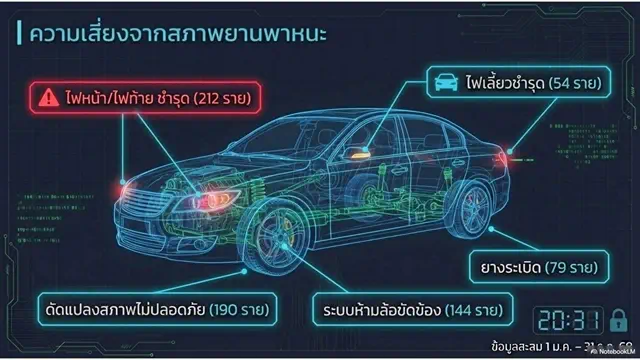 ข้อมูลเชิงวิเคราะห์ยังชี้ให้เห็นว่า ความเสี่ยงต่อการเกิดอุบัติเหตุจำนวนไม่น้อยเกิดจากสภาพยานพาหนะที่ไม่พร้อมใช้งาน โดยเฉพาะไฟหน้าและไฟท้ายชำรุด ซึ่งทำให้ทัศนวิสัยในการมองเห็นลดลงและผู้ร่วมทางสังเกตเห็นได้ยาก, การดัดแปลงสภาพรถที่ไม่ได้มาตรฐานทางวิศวกรรม ส่งผลต่อสมรรถนะการควบคุมรถ, ระบบเบรกขัดข้อง ทำให้ไม่สามารถหยุดรถได้ทันในสถานการณ์ฉุกเฉิน และยางระเบิดจากการเสื่อมสภาพหรือเติมลมไม่เหมาะสม ซึ่งอาจทำให้รถเสียการทรงตัวอย่างฉับพลัน รวมถึงไฟเลี้ยวชำรุด ซึ่งทำให้ไม่สามารถแจ้งเตือนผู้ร่วมทางก่อนเปลี่ยนช่องจราจรหรือลี้ยวรถ นำไปสู่การเฉี่ยวชนได้ง่าย