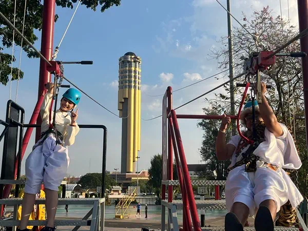 ก่อนเริ่มแถลงข่าวอย่างเป็นทางการ ผู้ว่าฯ ชัชวาลย์ แปลงกายเป็น “ชูชก”พา “นางมัทรี” โหน Zipline เข้าสู่เมืองสาเกต นคร ตามหากัณหา–ชาลี