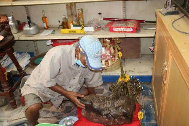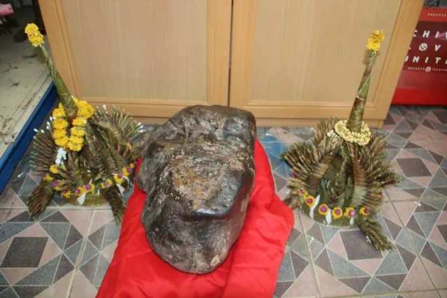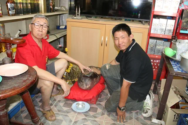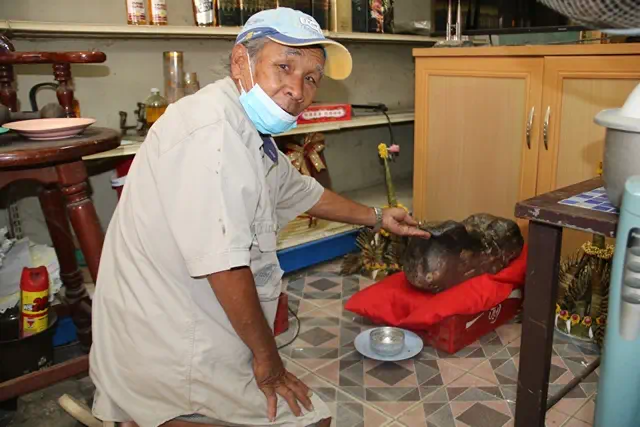 กาฬสินธุ์ฮือฮาเสี่ยใหญ่ค้าของชำเมืองน้ำดำบูชาหินประหลาดคล้ายกบเรืองแสงแห่ขอหวยให้โชค