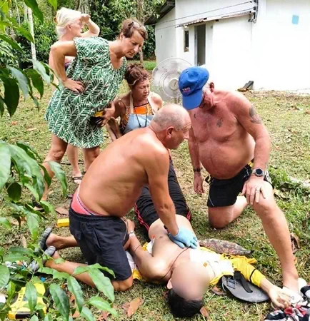 และได้รับแจ้งจากผู้แจ้งว่ามีอดีตทีมแพทย์จากประเทศนอร์เวย์ที่มาท่องเที่ยวจังหวัดกระบี่ กำลังให้การช่วยเหลือ CPR ร่วมกับใช้ครื่อง AED กดปุ๋มช็อคไปทั้งหมด 4 รอบ เพื่อช่วยฟื้นคืนชีพผู้ป่วยระหว่างรอหน่วยกู้ชีพเข้าไปรับ ผลการรักษาผู้ป่วยกลับมามีสัญญาณชีพอีกครั้งและรักษาต่ออยู่ที่โรงพยาบาลกระบี่ ซึ่งมีระยะทาง 21 กิโลเมตร ซึ่งใช้ระยะทางในการเดินทางค่อนข้างไกลจากโรงพยาบาล
