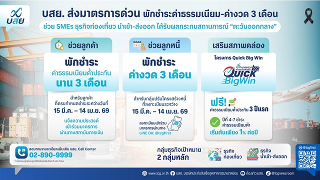 3. มาตรการเสริมสภาพคล่อง โครงการค้ำประกันสินเชื่อ “บสย. Quick Big Win” มุ่งลดภาระทางการเงินให้ SMEs ที่ได้รับผลกระทบ ด้วยจุดเด่น ฟรี! ค่าธรรมเนียมค้ำประกัน 3 ปีแรก ค่าธรรมเนียมต่ำ เริ่มต้นเพียง 1% ต่อปี ในปีที่ 4-7 โดยคิดค่าธรรมเนียมตามระดับความเสี่ยง (RBP) มุ่งชดเชย NPL ในอัตราสูง (Max Claim) เพื่อกระตุ้นการปล่อยสินเชื่อให้ SMEs ตอบโจทย์ทั้งลูกค้า บสย. และกลุ่มผู้ประกอบการใหม่ที่ยังไม่เคยใช้บริการค้ำประกันสินเชื่อกับ บสย. ที่ต้องการขอสินเชื่อเพื่อใช้เป็นเงินทุนหมุนเวียนในกิจการ เปิดรับคำขอค้ำประกันตั้งแต่วันนี้ ถึง 30 ธันวาคม 2569