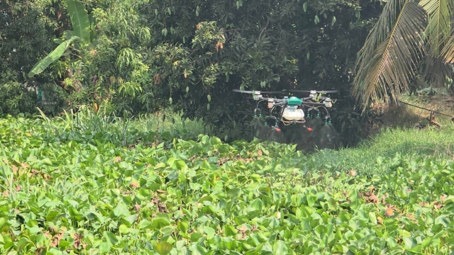 จากนั้น พล.ต.ท.คำรณวิทย์ ธูปกระจ่าง นายก อบจ.ปทุมธานี พร้อมทีมงานและเจ้าหน้าที่เทศบาลตำบลบางเดื่อ ได้ลงพื้นที่คลองบางโพธิ์ใต้ เพื่อทดลองฉีดพ่นสารผ่านเทคโนโลยีโดรนขนาดใหญ่ โดยมี นายถิรวัฒน์ ญาณวินะโย ผู้แทนบริษัท เซกุโม นำโดรนมาสาธิตการทดสอบระบบ ซึ่งในครั้งนี้ พล.ต.ท.คำรณวิทย์ ได้ทำการบังคับโดรนทางการเกษตรเพื่อพ่นสารชีวภาพด้วยตนเอง ก่อนจะเดินทางไปยังพื้นที่หน้าวัดบ่อเงิน อ.ลาดหลุมแก้ว ในเวลา 12.00 น. เพื่อสาธิตให้แก่นายกในพื้นที่และสมาชิกสภาจังหวัด (สจ.) ได้เห็นถึงประสิทธิภาพของนวัตกรรมดังกล่าว สำหรับสารผสมสูตร สวพ.62 (ชป.1) เป็นผลงานวิจัยจากสำนักวิจัยและพัฒนา กรมชลประทาน