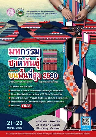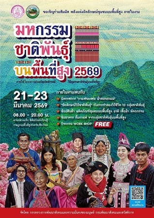 ทั้งนี้ ขอเชิญชวนประชาชนและนักท่องเที่ยวร่วมเปิดประสบการณ์ท่องเที่ยวเชิงวัฒนธรรมท่ามกลางเสน่ห์ของความหลากหลายทางชาติพันธุ์ ในงาน “มหกรรมชาติพันธุ์บนพื้นที่สูง 2569” ระหว่างวันที่ 21 – 23 มีนาคม 2569 เวลา 08.00 – 20.00 น. ณ พิพิธภัณฑ์เรียนรู้ราษฎรบนพื้นที่สูง สวนล้านนา ร.9 จังหวัดเชียงใหม่