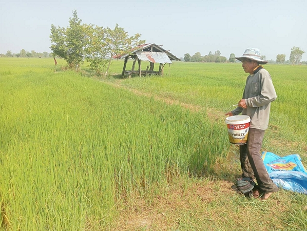 “เมื่อราคาปุ๋ยเคมีสูงขึ้น และไม่มั่นใจว่าจะได้ผลผลิตสูงดังกล่าว ตนและเพื่อนชาวนาหลายราย จึงได้ปรับลดปริมาณการใช้ปุ๋ยเคมีลง เพื่อประหยัดทุนทำนา จากที่เคยใช้ไร่ละ 1 ถุงหรือทั้งหมด 40 ถุง เหลือเพียง 17 ถุงเท่านั้น โดยใช้ปุ๋ยน้ำทางใบหรือฉีดพ่นฮอร์โมนทดแทน และจะหมั่นสำรวจว่าบริเวณใดที่ต้นข้าวเติบโตช้า หรือใบข้าวมีสีเหลือง เพราะรับสารอาหารไม่เพียงพอ จึงจะหว่านเม็ดปุ๋ยเคมีซ้ำ เพื่อให้ต้นข้าวได้แตกกอและออกรวงอย่างเต็มที่