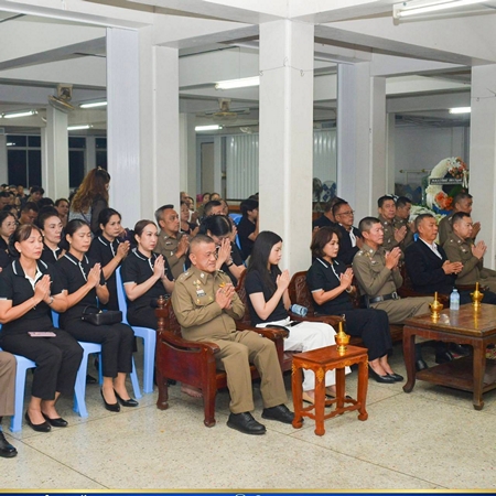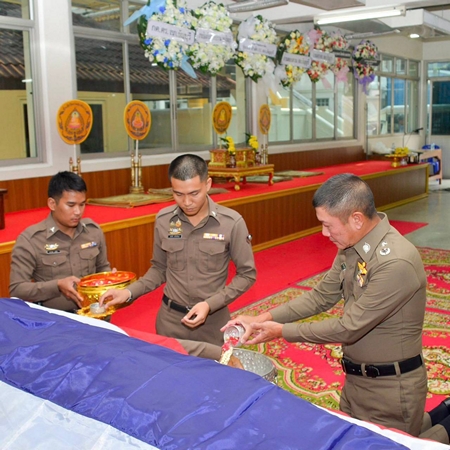 โดยมีนายตำรวจระดับผู้บังคับบัญชาตำรวจ พ.ต.อ.วิวัฒน์ อัศวะวิบูลย์ ผกก.สภ.เมืองปทุมธานี อดีตผกก.สภ.ธัญบุรี พ.ต.อ.จิรวัฒน์ เปี่ยมปิ่นเศรษฐ ผกก.สภ.อินทร์บุรี จ.สิงห์บุรี อดีต ผกก.สภ.ธัญบุรีโดยมีผู้บังคับบัญชาจัดพวงหรีดเพื่อเป็นการแสดงความเสียใจกับครอบครัวผู้เสียชีวิตประกอบด้วย พล.ต.ท.วัฒนา ยี่จีน ผบช.ภ.1 พล.ต.ต.อภิรักษ์ เวชกาญจนา รองผบช.ภ. ตำรวจ สภ.ธัญบุรี และรุ่นท14 ป่าสัก 31 สภ.ธัญบุรี และเพื่อนข้าราชการตำรวจสภ.ธัญบุรี พร้อมด้วย นายชุมพร กองอุดม อายุ 61 ปี บิดาของผู้เสียชีวิต และญาติร่วมพิธีรดน้ำศพบรรยากาศเป็นอย่างความเศร้าโศกเสียใจของเพื่อนข้าราชการตำรวจ
