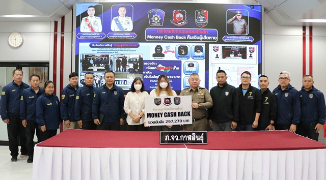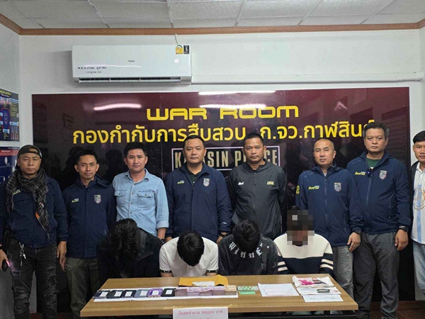 วันที่ 26 มีนาคม 2569 ที่ห้องประชุมชัยสุนทร ตำรวจภูธร จ.กาฬสินธุ์ พล.ต.ต.ทรงพล บริบาลประสิทธิ์ ผบก.ภ.จว.กาฬสินธุ์ พ.ต.อ.ขจรฤทธิ์ วงศ์ราช รองผบก.ภ.จว.กาฬสินธุ์ พ.ต.อ.นพวิทย์ ดิษฐาธนาธรสิริ ผกก.สืบสวน ภ.จว.กาฬสินธุ์ พร้อมด้วยชุดสืบสวน ภ.จว.กาฬสินธุ์ และชุดสืบสวนสภ.เมืองกาฬสินธุ์ร่วมกันแถลงผลการทลายแก๊งตะเวนถอนเงินสด หรือ “ม้ากดเงิน” เครือข่ายลูกสมุนแก๊งสแกมเมอร์จีนเทา พร้อมนำเงินที่จำนวน 297,270 บาท ส่งคืนให้กับน.ส.ชญาดา โกกะนุทรานนท์ อายุ 21 ปี ชาวกรุงเทพฯ ผู้เสียหายที่ถูกแก๊งดังกล่าวหลอกให้โอนเงิน หลังจากเจ้าหน้าที่ชุดสืบสวนจับกุมผู้ต้องหา 4 ราย และขยายผลจนสามารถติดตามเงินคืนผู้เสียหายได้สำเร็จ