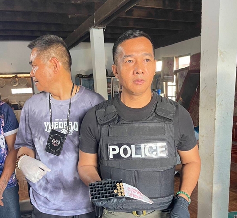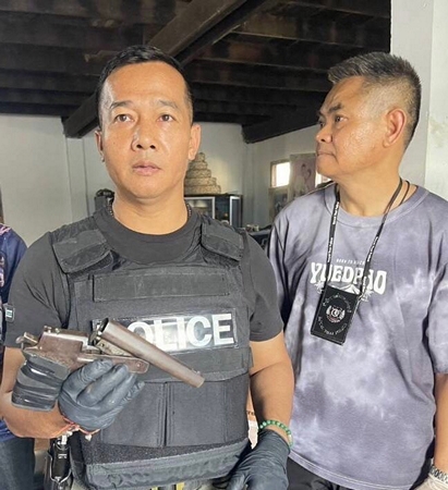 พร้อมของกลางอาวุธปืนพกสั้น ไทยประดิษฐ์ แบบ หักคอ 3 กระบอก, อาวุธปืนพกสั่น แบบ ลูกโม่ 1 กระบอก, อาวุธปืน ปากกา 4 กระบอก, ลำกล้องปืน ปากกา จำนวน 15 อัน, กระสุนปืน ลูกซอง จำนวน 25 นัด, กระสุนปืน ขนาด .38  ขนาด 9 มม. ขนาด .22  รวม  53  นัด และอุปกรณ์ เครื่องมือ ทำ ประกอบ ผลิต อาวุธปืนอีก จำนวน 12 รายการ