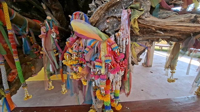 ชาวบ้านสายมูก็ได้มาขอโชคขอลาภ หากใครประสบผลสำเร็จ ก็จะนำพวงมาลัยดอกไม้ธูปเทียน พร้อมกับเครื่องบวงสรวงตามแต่ใครจะอธิษฐานอะไรไว้ ก็จะนำสิ่งนั้นมาถวายแก้บน สังเกตได้ว่า ภายในต้นมะขามยักษ์ที่มีความเก่าแก่ จะมีพวงดอกไม้มากมาย ซึ่งในช่วงกลางเดือนเมษายน ชาวบ้านจะทำบุญเปลี่ยนผ้าคลุม ให้กับต้นมะขามยักษ์นี้เป็นประจำทุกปี.