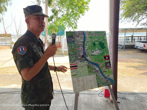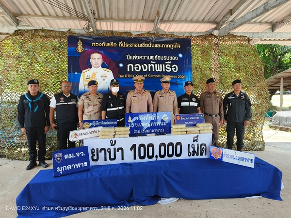 เมื่อวันที่ 31 มีนาคม 2569 ที่สถานีเรือมุกดาหาร น.อ.ปุณณรัตน์ ถมคำ หัวหน้ายุทธการและการข่าว หน่วยเรือรักษาความสงบเรียบร้อยตามลำแม่น้ำโขง (นรข.) เขตนครพนม พร้อมด้วย นายนที พรหมภักดี นายอำเภอเมืองมุกดาหาร และ พ.ต.อ.หญิง อมรรัตน์ บัวศรี นวท.(สบ 4) พฐ.จว.มุกดาหาร ร่วมกันแถลงข่าวผลการตรวจยึดยาเสพติดให้โทษประเภท 1 (ยาบ้า) จำนวน 100,000 เม็ด