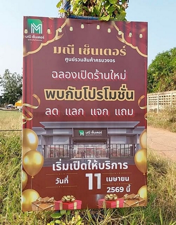“อย่างไรก็ตาม ในการเปิดร้านมณี เซ็นเตอร์ดังกล่าว ยังถือว่าเป็นการสร้างอาชีพ สร้างงาน และรายได้ ให้พี่น้องประชาชนในพื้นที่ได้เป็นอย่างดี ทั้งคนงาน เจ้าหน้าที่ทุกแผนก เป็นคนในชุมชน ได้มีงานทำใกล้บ้าน อยู่ใกล้ครอบครัวอีกด้วย ทั้งนี้ จะจัดจำหน่ายสินค้าที่จำเป็นในชีวิตประจำวันและการประกอบอาชีพของพี่น้องประชาชน โดยเน้นคุณภาพ ความคุ้มค่า ราคาประหยัด พี่น้องประชาชนสามารถเข้าถึงได้ง่าย ที่สำคัญเป็นศูนย์จำหน่ายสินค้าใกล้บ้าน ไม่ต้องเสียเวลา และเปลืองค่าน้ำมันไปหาซื้อในตัวจังหวัด โดยเฉพาะในยุคน้ำมันแพง สินค้าทั่วไปกำลังปรับขึ้นราคา แต่ที่ร้านของเรา จำหน่ายในราคาที่เป็นธรรม ไม่เอาเปรียบผู้บริโภค ทั้งนี้ ได้ฤกษ์ดี เพื่อความเป็นสิริมงคล กำหนดเปิดร้านอย่างเป็นทางการ ในวันที่ 11 เมษายน 2569 นี้ ที่ตรงกับวันต้อนรับเทศกาลสงกรานต์ปีใหม่ไทยพอดี เชื่อว่าจะได้รับการตอบรับจากลูกค้าเป็นอย่างดียิ่ง”